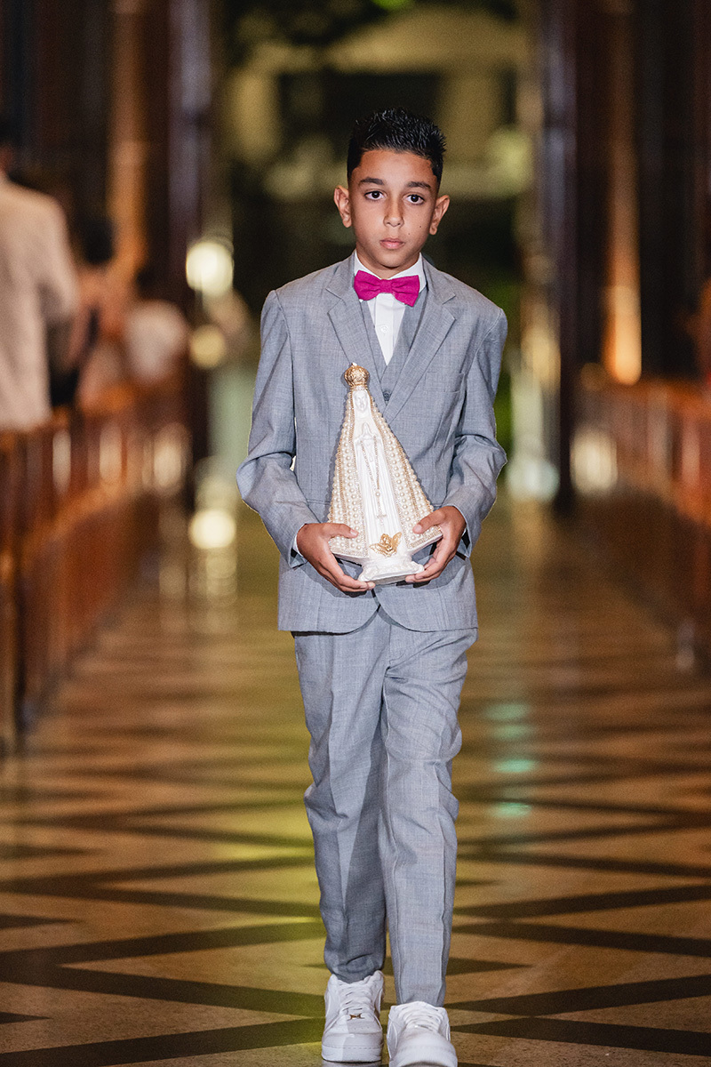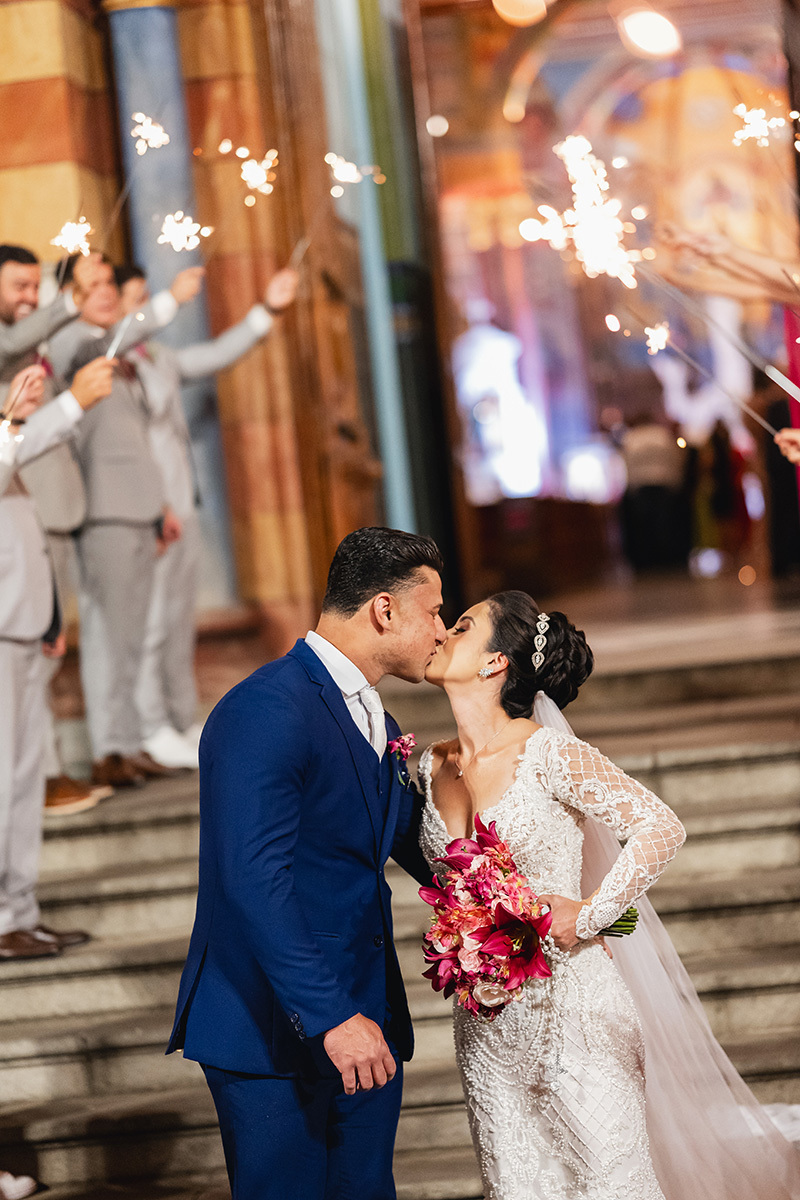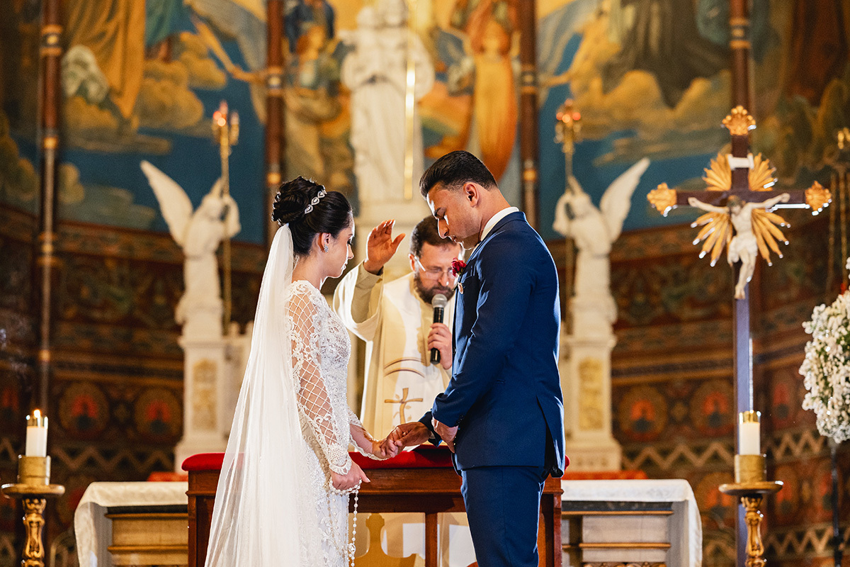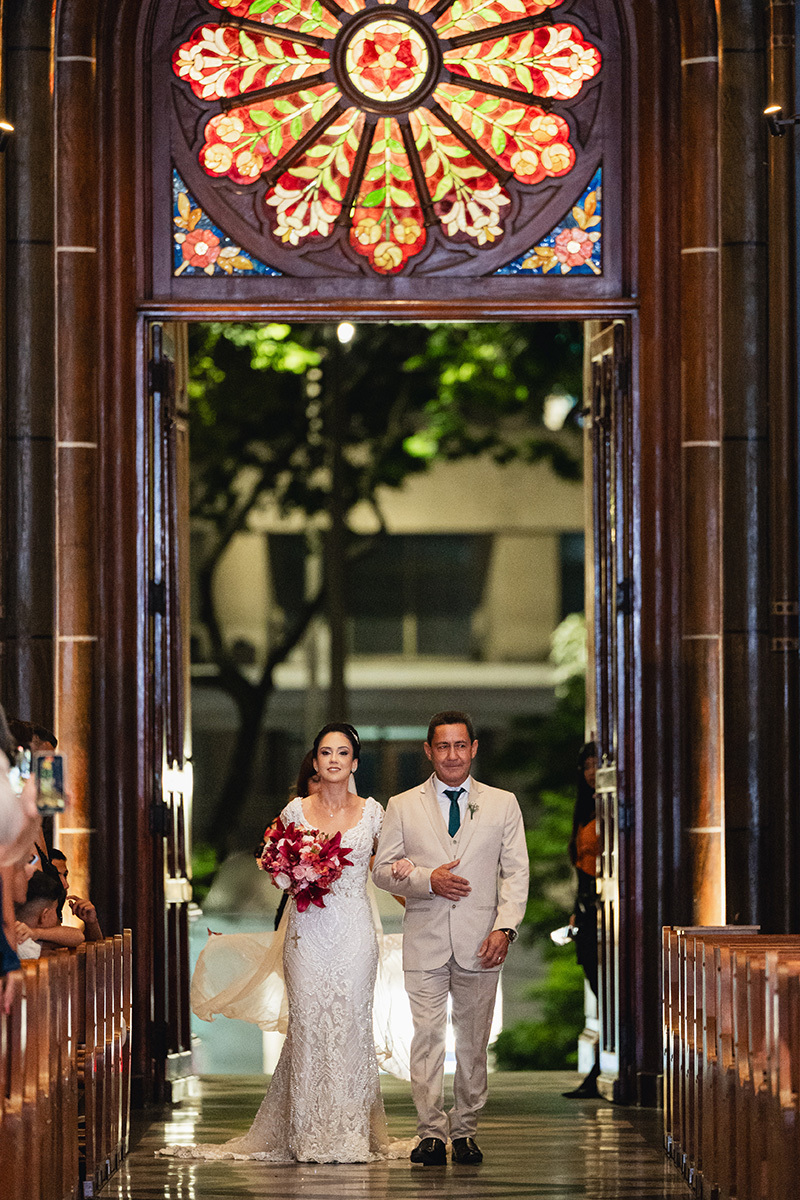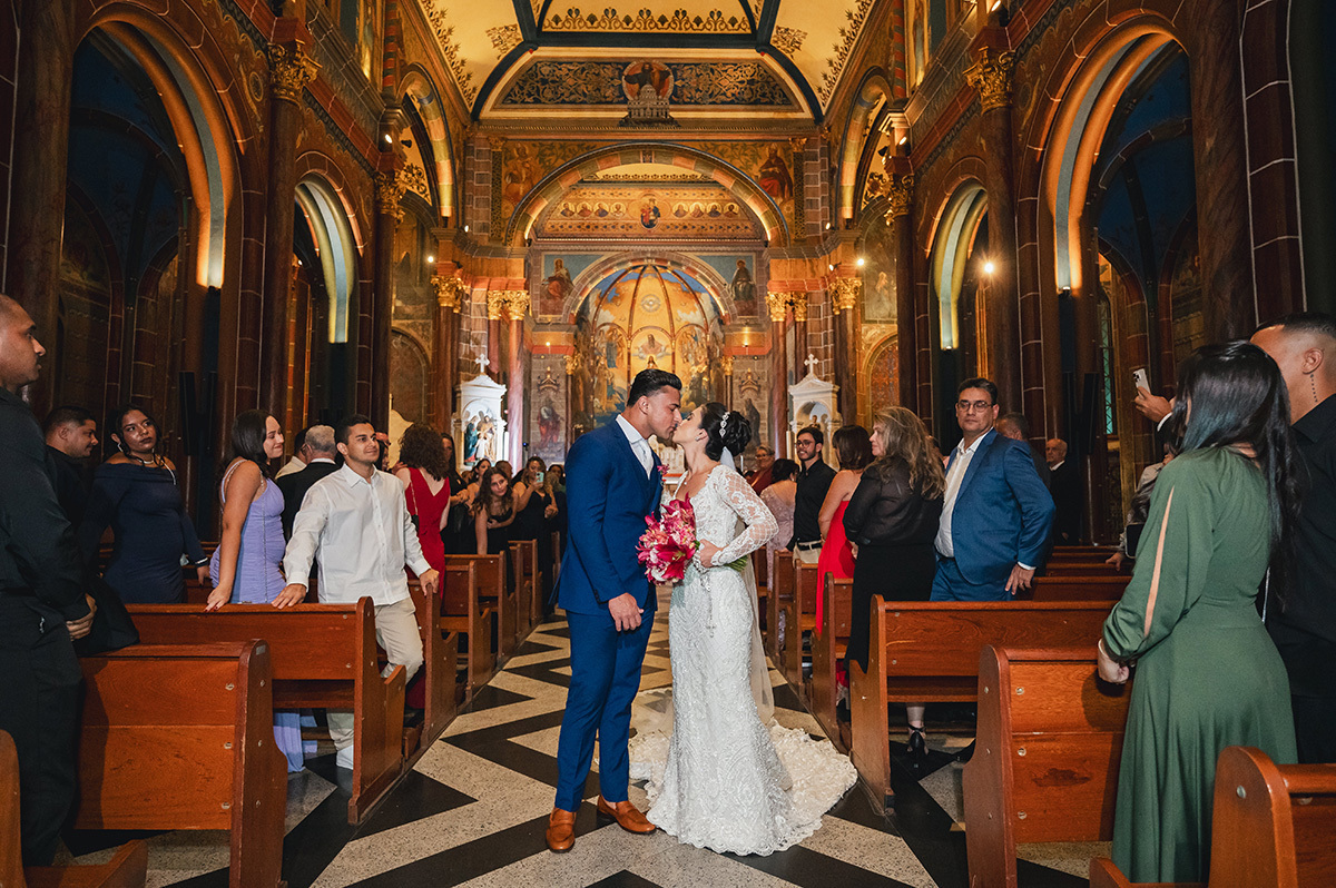 A iluminação noturna da São José cria uma atmosfera íntima e solene, perfeita para destacar a suntuosidade das pinturas de Alberto Delpino e a grandiosidade do corredor central. Cada clique capturou não apenas o protocolo, mas a conexão real de um casal que transborda cumplicidade. A celebração foi um verdadeiro testemunho de fé, cercada por amigos e familiares que vibraram a cada instante.