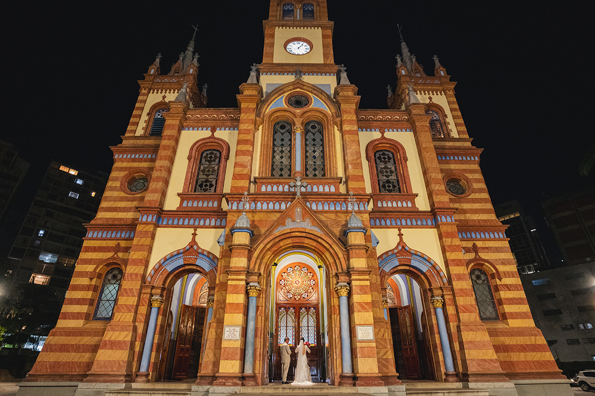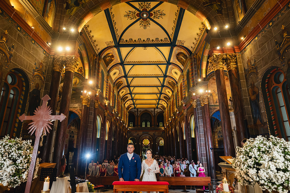 Para selar essa união, eles escolheram um dos marcos mais icônicos da nossa capital: a Igreja São José em BH. Realizar um casamento católico à noite sob as naves neogóticas desse santuário é sempre uma experiência cinematográfica.