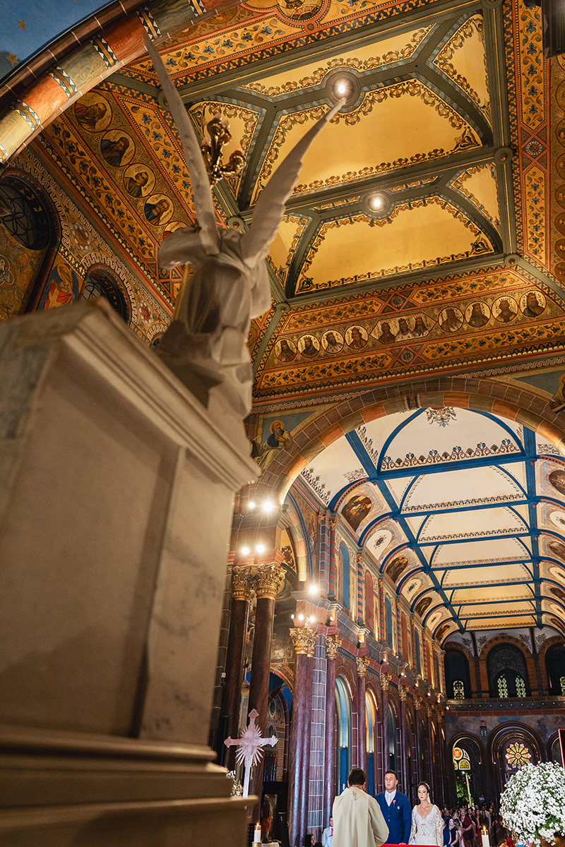 A Erika estava radiante, trazendo uma serenidade que preencheu todo o santuário. O Heuller, visivelmente emocionado, aguardava no altar daquela que é uma das igrejas mais tradicionais para casamentos em Belo Horizonte.